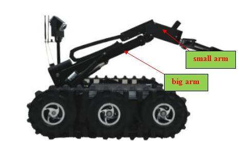 Mobile robot body is made up of box, electrical motor, driving system, mechanical arm, cradle head, monitoring system, lighting, explosives disrupter base, rechargeable battery, towing ring, etc.